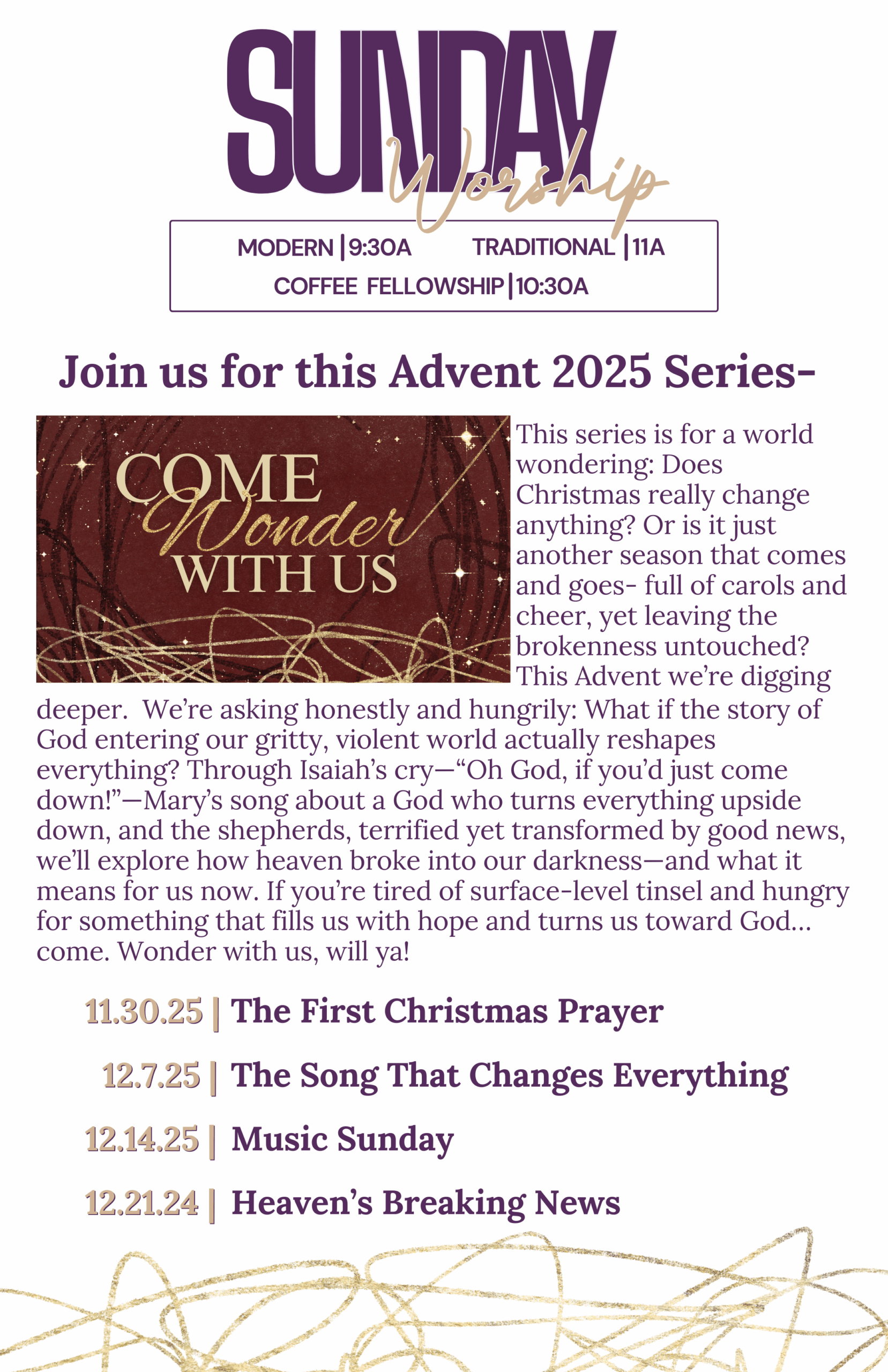 This series is for a world wondering: Does Christmas really change anything? Or is it just another season that comes and goes- full of carols and cheer, yet leaving the brokenness untouched? This Advent, we’re digging deeper. We’re asking honestly and hungrily: What if the story of God entering our gritty, violent world actually reshapes everything? Through Isaiah’s cry—“Oh God, if you’d just come down!”—Mary’s song about a God who turns everything upside down, and the shepherds, terrified yet transformed by good news, we’ll explore how heaven broke into our darkness—and what it means for us now. If you’re tired of surface-level tinsel and hungry for something that fills us with hope and turns us toward God… come. Wonder with us, will ya!