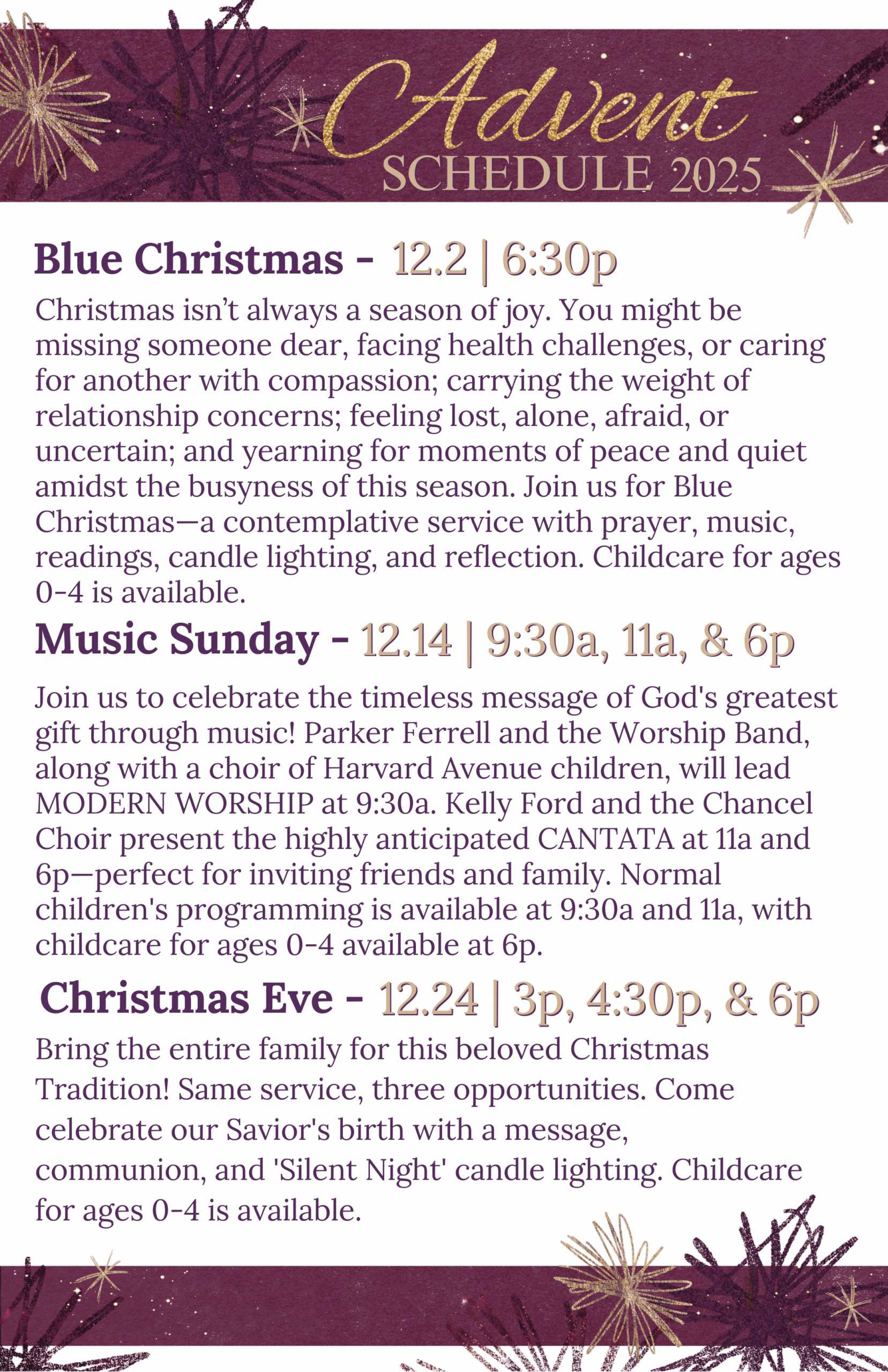 Our companion guide, written by Rev. Whitney Waller Garcia, for this year’s Advent series is ready for you—full of scripture, reflections, and simple ways to center your heart as we move toward Christmas. Grab a copy at either Welcome Desk this Sunday or DOWNLOAD IT HERE and journey with us through the season of expectation.